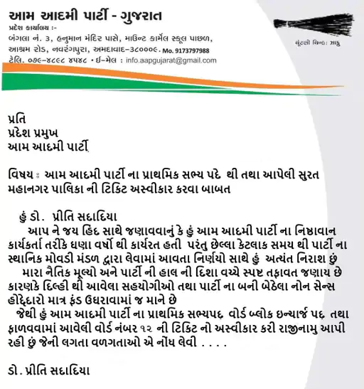 આ સાથે જ વોર્ડ નં. 26ના પૂર્વ ઉમેદવાર ડો. નીતા બલદાણિયાએ પણ રાજીનામું આપતા જણાવ્યું કે પાર્ટીની હાલની કાર્યપદ્ધતિ તેમના મૂલ્યો સાથે મેળ ખાતી નથી. તેમણે સંકલન અને પારદર્શિતાના અભાવની વાત કરી હતી.