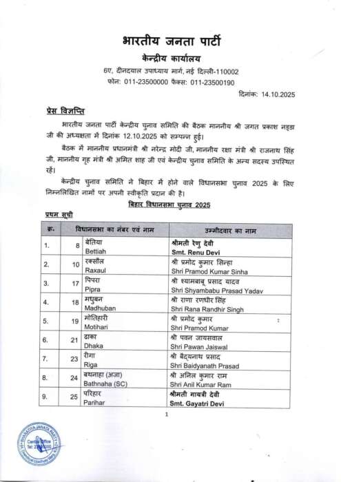 ભારતીય જનતા પાર્ટીએ બિહાર વિધાનસભા ચૂંટણી માટે 71 ઉમેદવારોની પ્રથમ યાદી જાહેર કરી છે. એનડીએમાં સીટ શેરિંગ પહેલા જ ફાઇનલ થઇ ગઇ છે અને ભાજપ 101 બેઠકો પર ચૂંટણી લડી રહ્યું છે. હવે ઉમેદવારોની પહેલી યાદી પણ જાહેર થઈ ગઈ છે. ભાજપ બિહાર અધ્યક્ષે પહેલા જ આ વાતનો સંકેત આપી દીધો હતો.