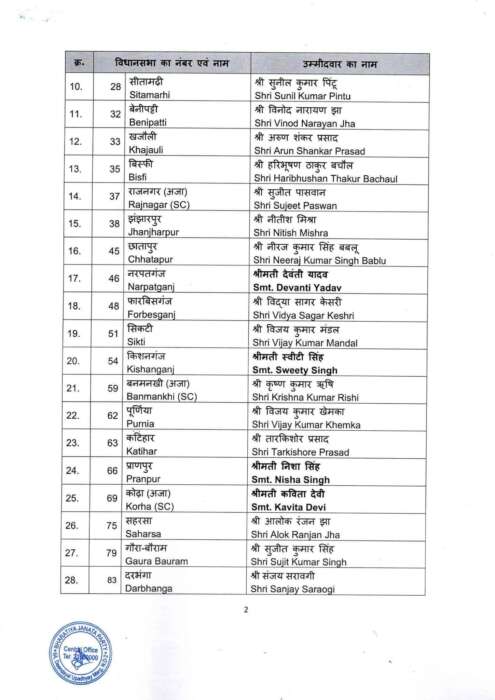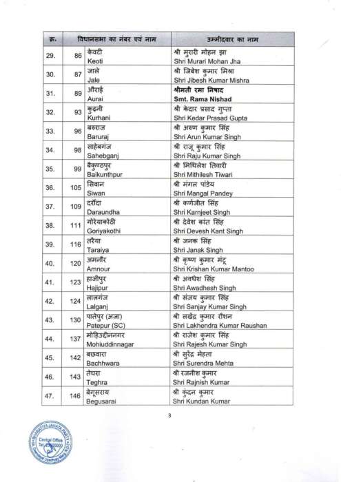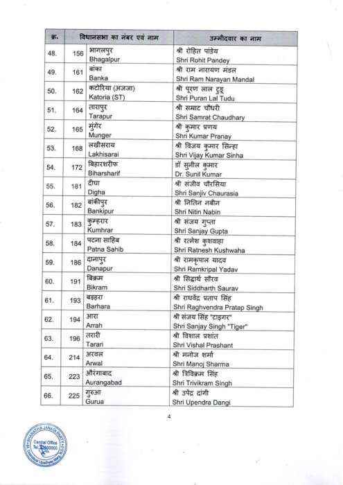 ભાજપે જાહેર કરેલી પ્રથમ યાદીમાં ઘણા મોટા નામો છે. ભાજપે તારાપુરથી ઉપ મુખ્યમંત્રી સમ્રાટ ચૌધરીને ટિકિટ આપી છે. 2021ની પેટાચૂંટણીમાં આ બેઠક જેડી-યુના રાજીવ કુમાર સિંહે જીતી હતી. લખીસરાયથી વિજય સિન્હા, સિવાનથી મંગલ પાંડે અને દાનાપુરથી રામ કૃપાલ યાદવને ટિકિટ આપી છે.