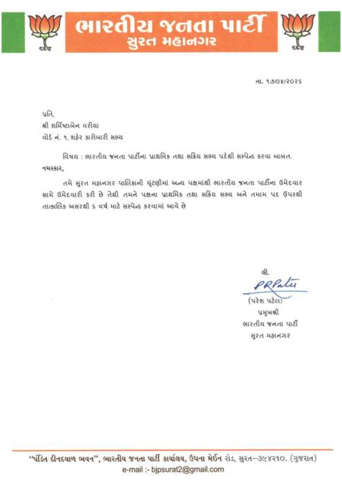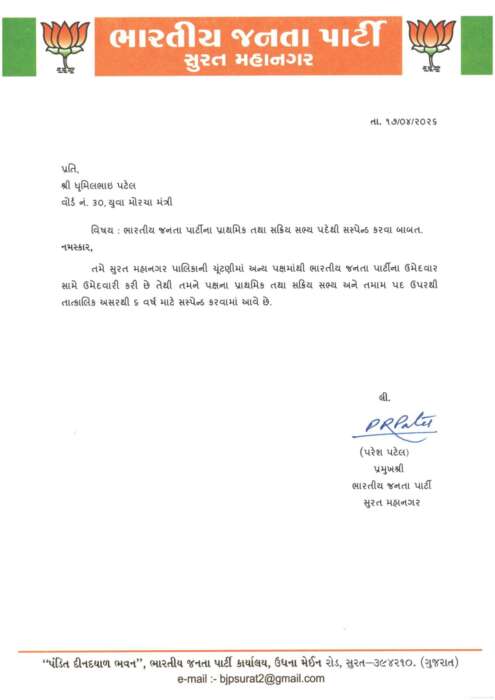સુરત શહેર ભાજપ પ્રમુખ પરેશ પટેલે જણાવ્યું કે, બંને નેતાઓએ પક્ષમાં મહત્વના પદ પર હોવા છતાં પક્ષ વિરોધી પ્રવૃત્તિ કરી છે. તેઓ હવે અન્ય પક્ષના સત્તાવાર ઉમેદવાર છે, તેથી તેમને ભાજપમાં રાખવાનો પ્રશ્ન જ ઊભો થતો નથી. આ નિર્ણય દ્વારા પાર્ટીએ સ્પષ્ટ સંદેશ આપ્યો છે કે પક્ષવિરોધી પ્રવૃત્તિઓ સહન નહીં કરવામાં આવે.
