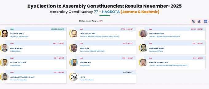 બિહારની સાથે આજે કેટલાક રાજ્યોમાં યોજાયેલી પેટા ચૂંટણીના પરિણામો પણ જાહેર થઈ રહ્યા છે. જમ્મુ-કાશ્મીરની નગરોટા વિધાનસભા બેઠકની પેટાચૂંટણીમાં ભારતીય જનતા પાર્ટી એ ભવ્ય જીત હાંસલ કરી છે. ચૂંટણી પંચે પરિણામો જાહેર કરી દીધા છે, જેમાં ભાજપના ઉમેદવાર દેવયાની રાણા 24,647 મતોની જંગી સરસાઈથી જીતી ગયા છે.