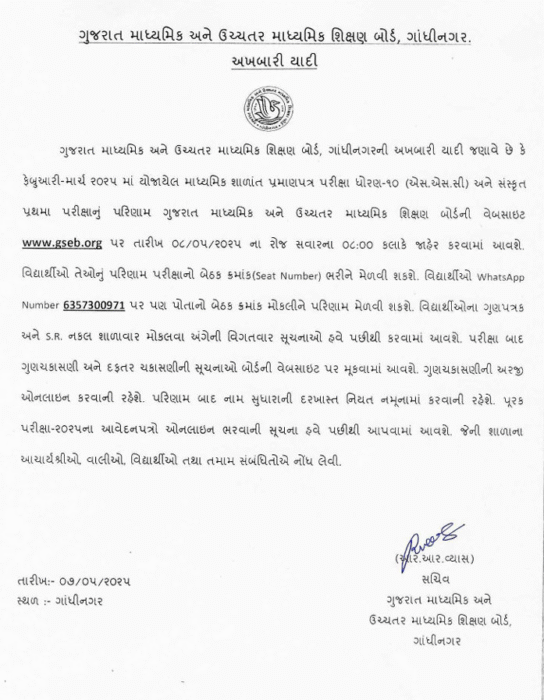 ગુજરાત બોર્ડનું ધોરણ 10નું રીઝલ્ટ 2025 મે 2025 માં જાહેર થવાની સંભાવના છે. વિદ્યાર્થીઓ ગુજરાત બોર્ડ ધોરણ 10 નું રીઝલ્ટ 2025 સત્તાવાર વેબસાઇટ – gseb.org પર જોઈ શકે છે. ઉમેદવારો તેમના સંદર્ભ માટે રીઝલ્ટ માર્કશીટ ડાઉનલોડ કરી શકે છે અને શાળા દ્વારા મંજૂર કરાયેલ ભૌતિક રીઝલ્ટ કાર્ડ એકત્રિત કરવું આવશ્યક છે. શાળા દ્વારા આપવામાં આવેલ દસ્તાવેજ એ સત્તાવાર દસ્તાવેજ છે.