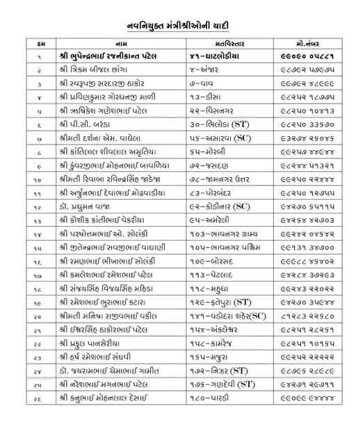 નવા મંત્રીઓમાં કાંતિ અમૃતિયા, કૌશિક વેકરીયા, અર્જુન મોઢવાડિયા, જીતુ વાઘાણી, રિવાબા જાડેજા, જયરામ ગામીત, દર્શના વાઘેલા, ઇશ્વરસિંહ પટેલને ફોન આવી ગયો છે. નવા મંત્રીઓને પ્રદેશ પ્રમુખ જગદીશ વિશ્વકર્મા ફોન કરીને જાણ કરી હતી.