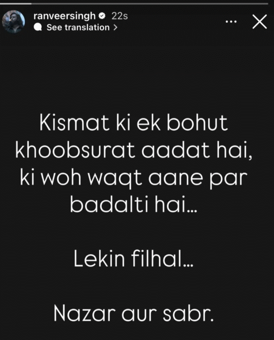 રણવીર સિંહે ‘ધુરંધર’ની સફળતા પર સોશિયલ મીડિયા પર પોસ્ટ શેર કરી છે. આ પોસ્ટ શેર કરતાં અભિનેતા ભાવુક નજરે પડ્યા હતા. તેમણે ઇન્સ્ટાગ્રામ પર લખ્યું હતું, ‘કિસ્મતની એક બહુ સુંદર આદત છે કે તે યોગ્ય સમય આવે ત્યારે બદલાય છે… પરંતુ હાલ માટે… નજર અને સબર.’