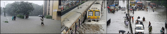 દેશની આર્થિક રાજધાની મુંબઈમાં મોડી રાતથી ભારે વરસાદ પડતાં હાલત દયનીય થઈ ગઇ છે. જનજીવન અસ્ત-વ્યસ્ત થઈ ગયું છે અને વાહનવ્યહારને પણ માઠી અસર થઇ છે. ભારે વરસાદને પગલે શહેરના અનેક વિસ્તારોમાં પાણી ભરાઈ ગયા છે. આટલું જ નહીં મુંબઈના અનેક મુખ્ય રેલવે સ્ટેશનોએ પણ પાટા ડૂબી ગયા હતા જેના પગલે ઘણી ટ્રેનો રદ કરવાની ફરજ પડી. લગભગ ૬ કલાકના સમયગાળામાં જ ૧૧થી ૧૨ ઈંચ જેટલો વરસાદ ખાબકી જતાં જનજીવન અસ્ત વ્યસ્ત થઈ ગયું હતું.