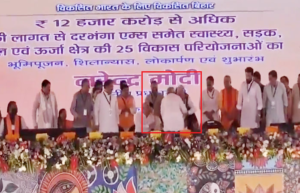 બિહારના મુખ્ય પ્રધાન નીતીશ કુમારે દરભંગામાં આયોજિત એક જાહેર કાર્યક્રમમાં વડા પ્રધાન નરેન્દ્ર મોદીના ચરણસ્પર્શ કરવાનો પ્રયાસ કરીને બધાને ચોંકાવી દીધા હતા. સોશિયલ મીડિયા પર વાયરલ થયેલા એક વીડિયોમાં 73 વર્ષીય નીતીશ કુમાર 74 વર્ષના પીએમ મોદી તરફ હાથ જોડીને ચાલતા જોવા મળ્યા પછી તેમણે પીએમ મોદીની નજીક પહોંચીને તેમના ચરણ સ્પર્શ કરવા ઝૂક્યા હતા. જોકે, એ સમયે પીએમ મોદી તેમને ચરણ સ્પર્શ કરતા અટકાવ્યા હતા અને તેમની સાથે હાથ મિલાવતા જોવા મળે છે.