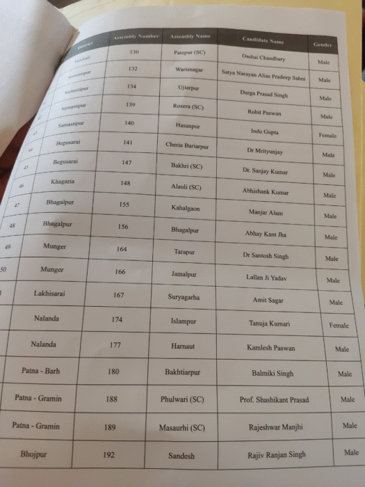 - પ્રથમ યાદીના જાતિગત સમીકરણ ની વાત કરીએ તો, સૌથી વધુ EBC (અત્યંત પછાત વર્ગ) માંથી 17 ઉમેદવારો, SC/ST માંથી 7, OBC માંથી 11, લઘુમતી માંથી 9 અને સામાન્ય વર્ગ માંથી 7 લોકોને ટિકિટ આપવામાં આવી હતી.
