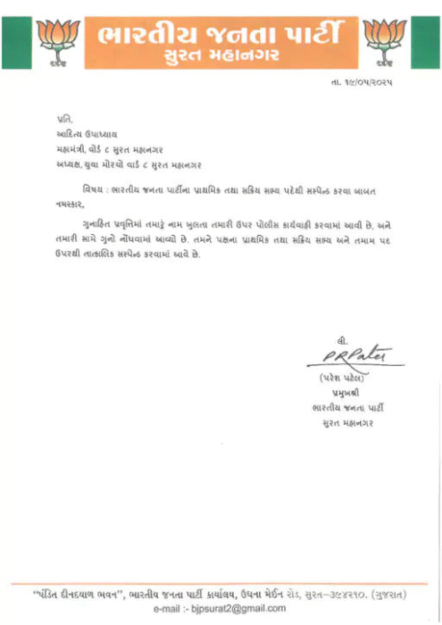 સુરતમાં યુવતી પર દુષ્કર્મ : BJP મહામંત્રી અને તેના મિત્ર વિરુદ્ધ ગુનાહિત કેસ નોંધાયો