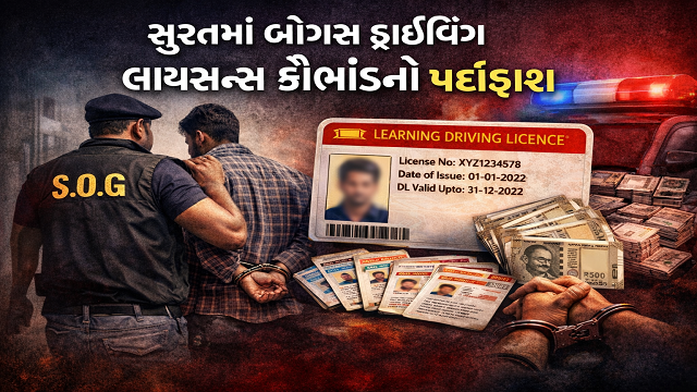 સુરત શહેરના કાપોદ્રા વિસ્તારમાં બોગસ ડ્રાઇવિંગ લાયસન્સ બનાવતા કૌભાંડનો પર્દાફાશ થયો છે. SOG દ્વારા દરોડા પાડી નકલી લર્નિંગ ડ્રાઇવિંગ લાયસન્સ બનાવતી ટોળકીને ઝડપી પાડવામાં આવી હતી.