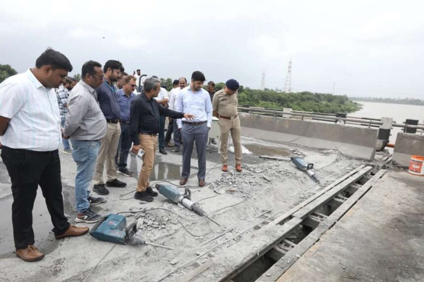 મુખ્યમંત્રી શ્રી ભૂપેન્દ્ર પટેલે વડોદરા જિલ્લાના મુજપુર-ગંભીરા પુલ દુર્ઘટના બાદ રાજ્યના તમામ પુલોની સલામતી ધ્યાને લેતા જાહેરહિતમાં તેની પુનઃ તાત્કાલિક ધોરણે સઘન ચકાસણી કરવાની સૂચના આપી હતી, જેના ભાગરૂપે જિલ્લા કલેક્ટર ડો.સૌરભ પારધીએ કામરેજ તાલુકાના ખોલવડ અને આંબોલીને જોડતા એન.એચ.-૪૮ પર તાપી નદી પરના બ્રિજની મુલાકાત લીધી હતી અને બ્રિજના એક્ષ્પાન્શન જોઈન્ટની સમારકામની કામગીરીનું નિરીક્ષણ કર્યું હતું. બ્રિજ રિપેરિંગની કામગીરીના કારણે બ્રિજ બંધ કરવામાં આવ્યો છે, ત્યારે આ રૂટ પરના ટ્રાફિકને વડોદરા મુંબઈ હાઈવેના કિમ ચાર રસ્તાથી એના સુધીના સેક્શન પર ડાયવર્ટ કરવામાં આવ્યો છે, જે સંદર્ભે નેશનલ હાઈવે ઓથોરિટીના અધિકારીઓ સાથે વાહનવ્યવહાર સરળ બને અને વાહનચાલકોને મુશ્કેલી ન પડે એ બાબતે ચર્ચાવિચારણા કરી જરૂરી સૂચના આપી હતી.